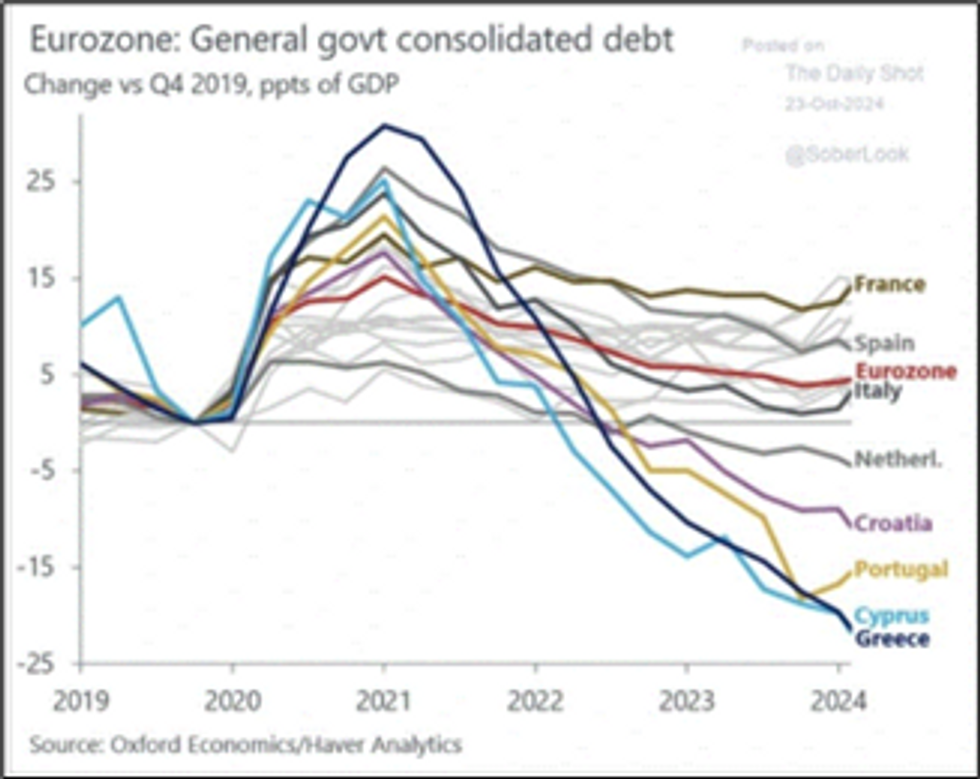 And precisely this last aspect has determined in the last 5 years a huge delta between France (the worst) and countries like Greece or Portugal (with strong growth, which have managed the post-Covid period very well) in terms of debt/GDP delta . France rose by 15 percentage points, Greece fell by 20, Portugal by 15. The graphic image from Oxford Economics is very explicit.