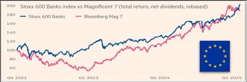 4. The performance of sectors and countries outside the radar of investors for a long time has been excellent, Especially in relative terms, going to highlight the strong rotation in place in the last month and a half on the world share markets. At the sectoral level, Food & Beverage, Healthcare, Mineraries and Industrial European species go up and the American American technological and consumer discretion and other higher beta growth sectors are descended. The banks fly on the stock exchange almost everywhere in the world, with overturned performances that have incredible as the graphic designer of the Financial Times and reworked by Banca Sello Sella & C. shows us. On a geographical level, China is back on the track with excellent performances and with various brokers and assets mangers to brindle at the return of the town of the Rising Sun among the investable markets (if it ever came out …). Europe (Stoxx600 +8%) has been above the United States since the beginning of 11 percentage points (S&P400 -3%).